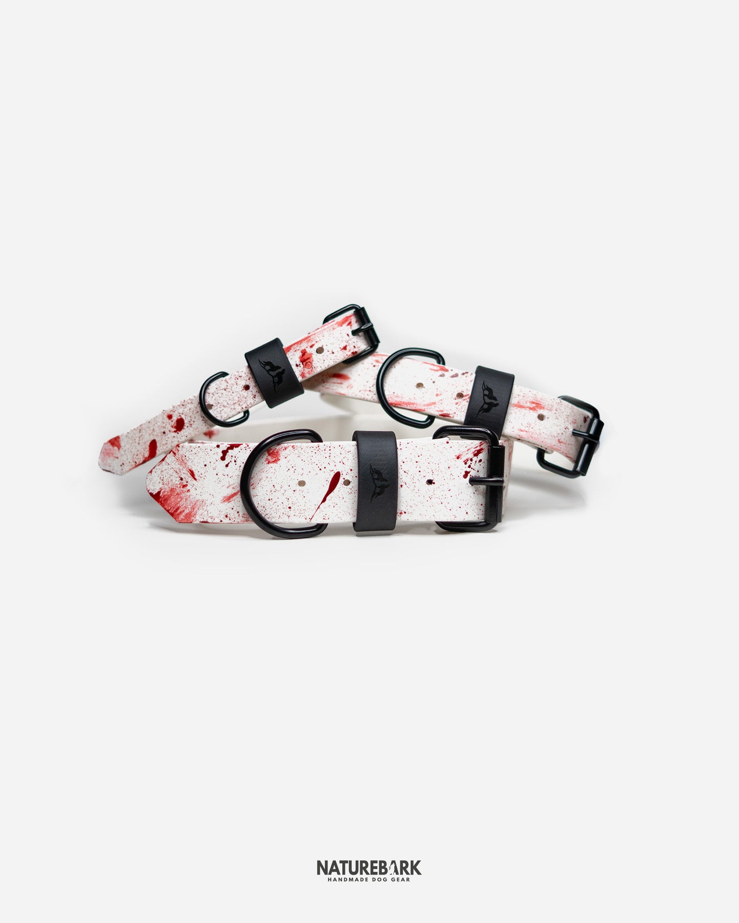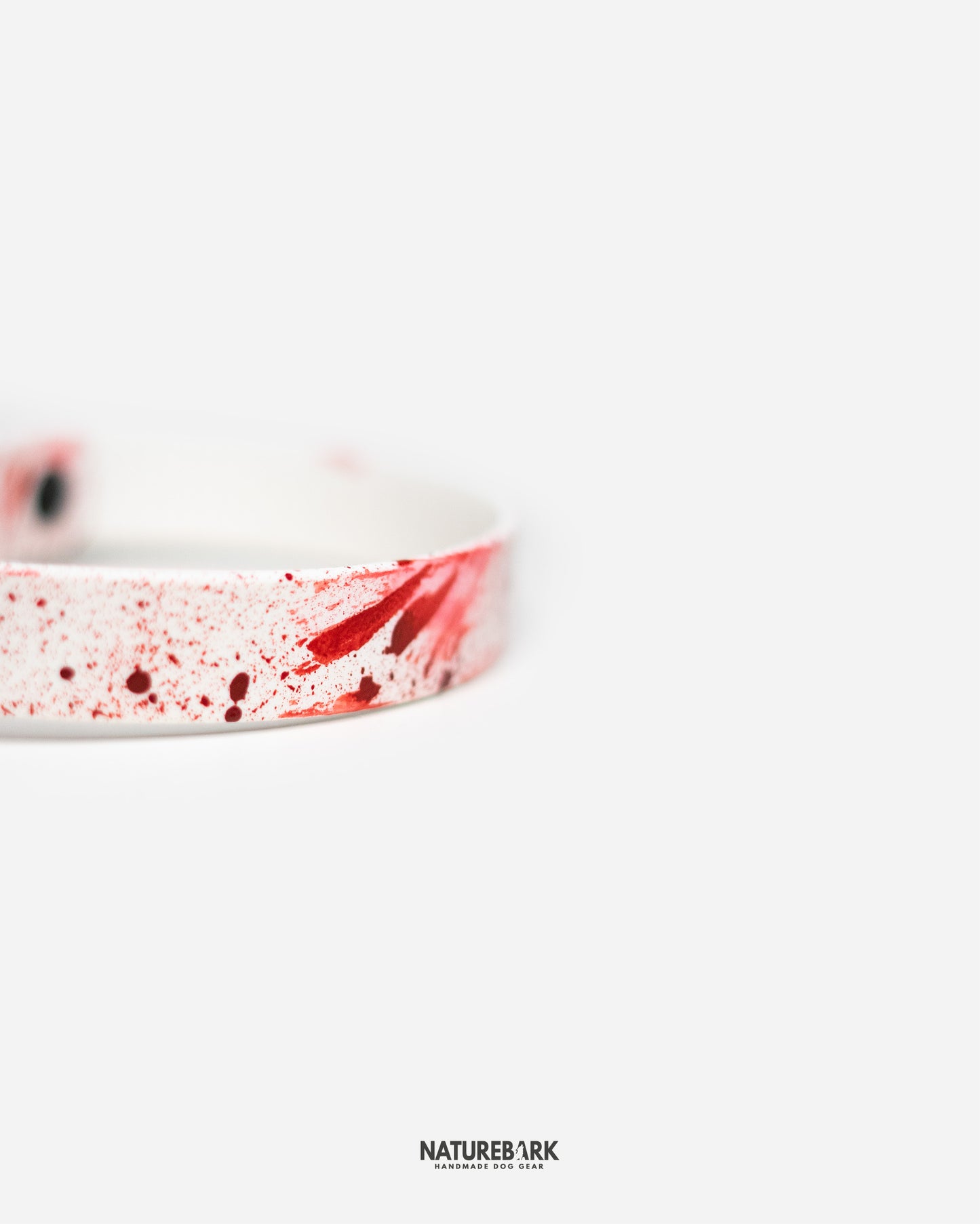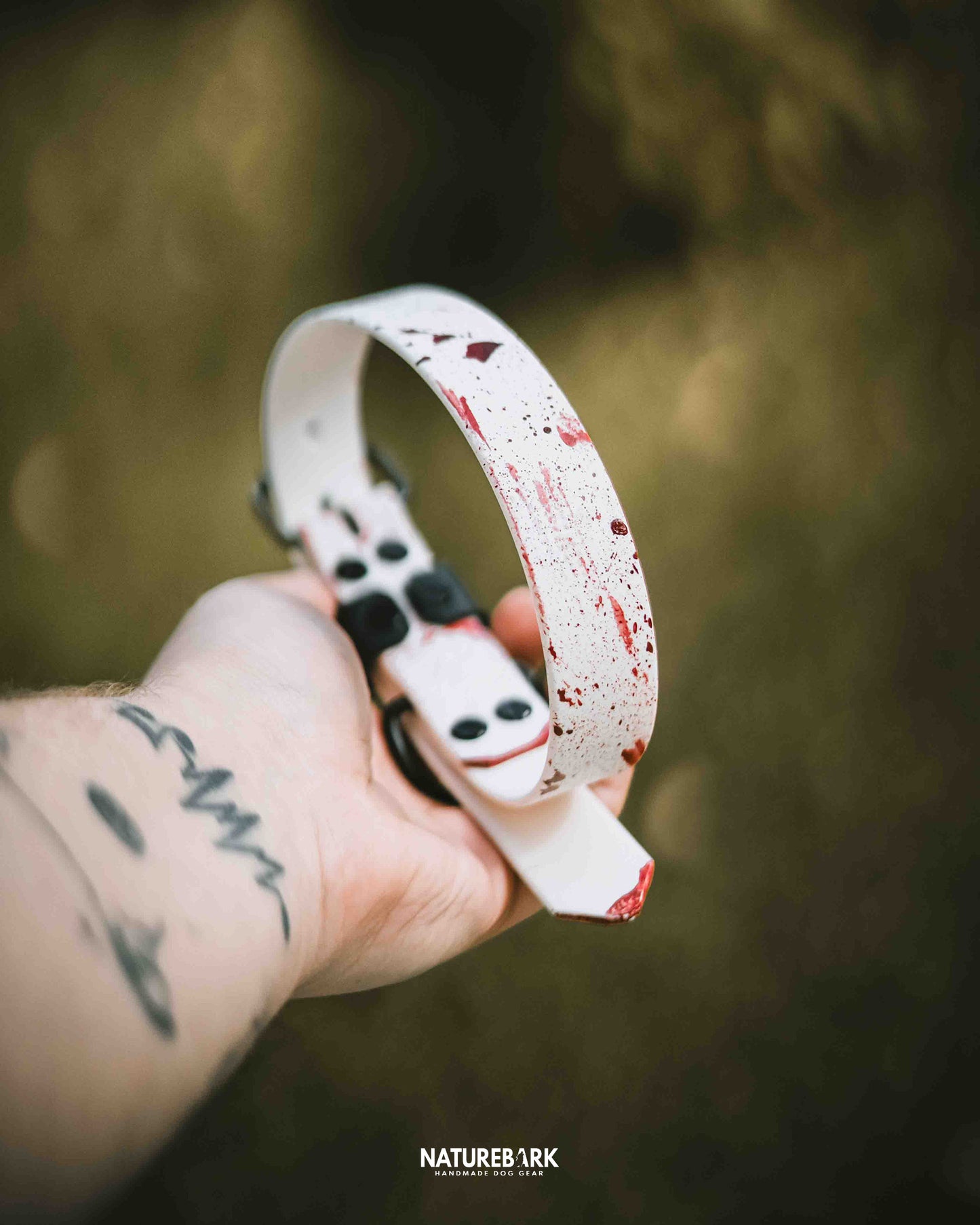 Für echte Horrorfans. Das Design ist mittels spezieller Farbe aufgetragen und versiegelt. Somit ist es genau so Robust und Wasserfest wie die anderen Halsbänder. Jedes Halsband wird dadurch ein absolutes Unikat.