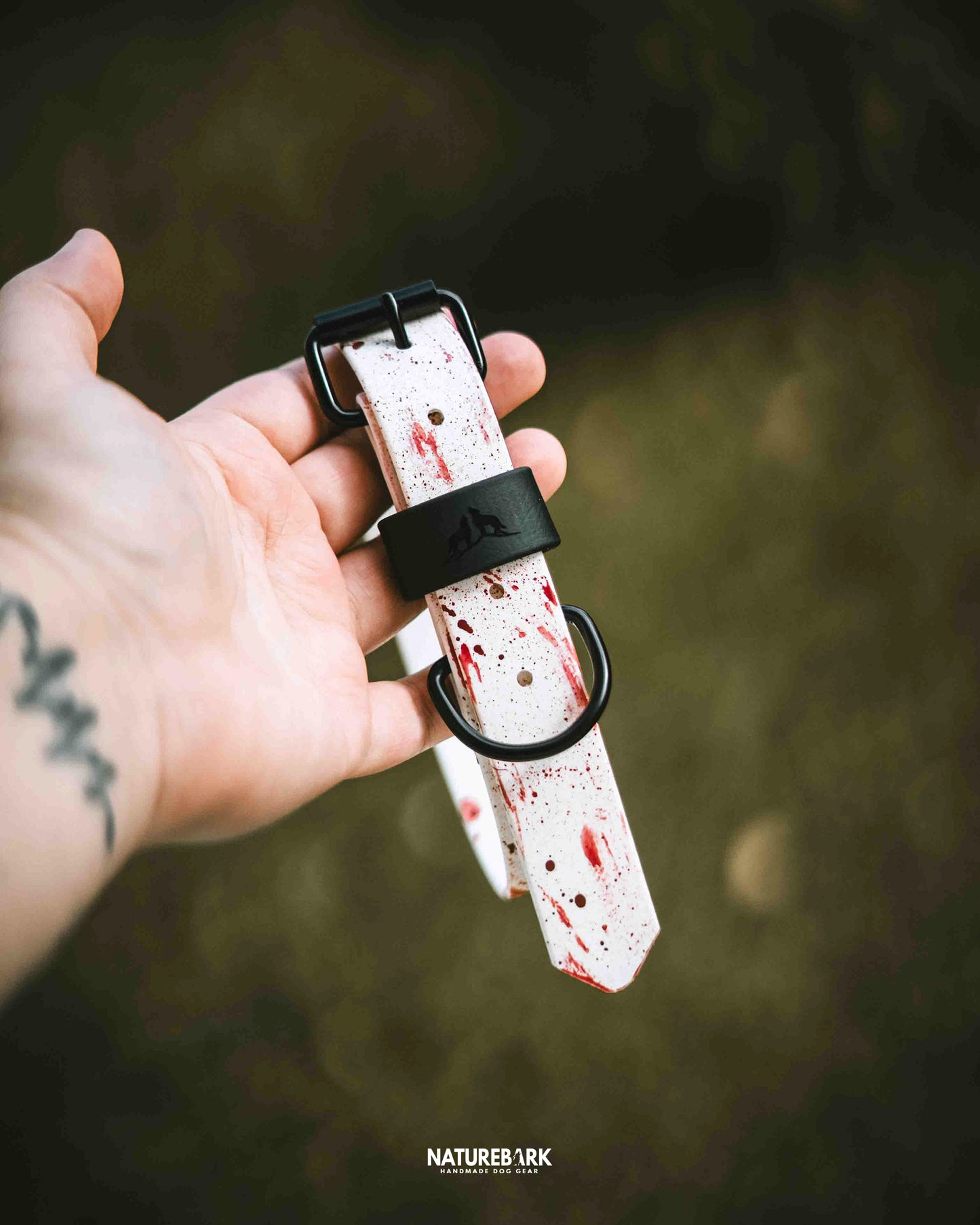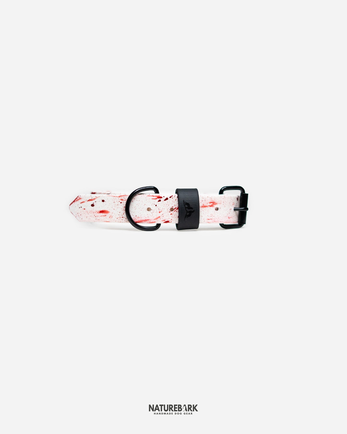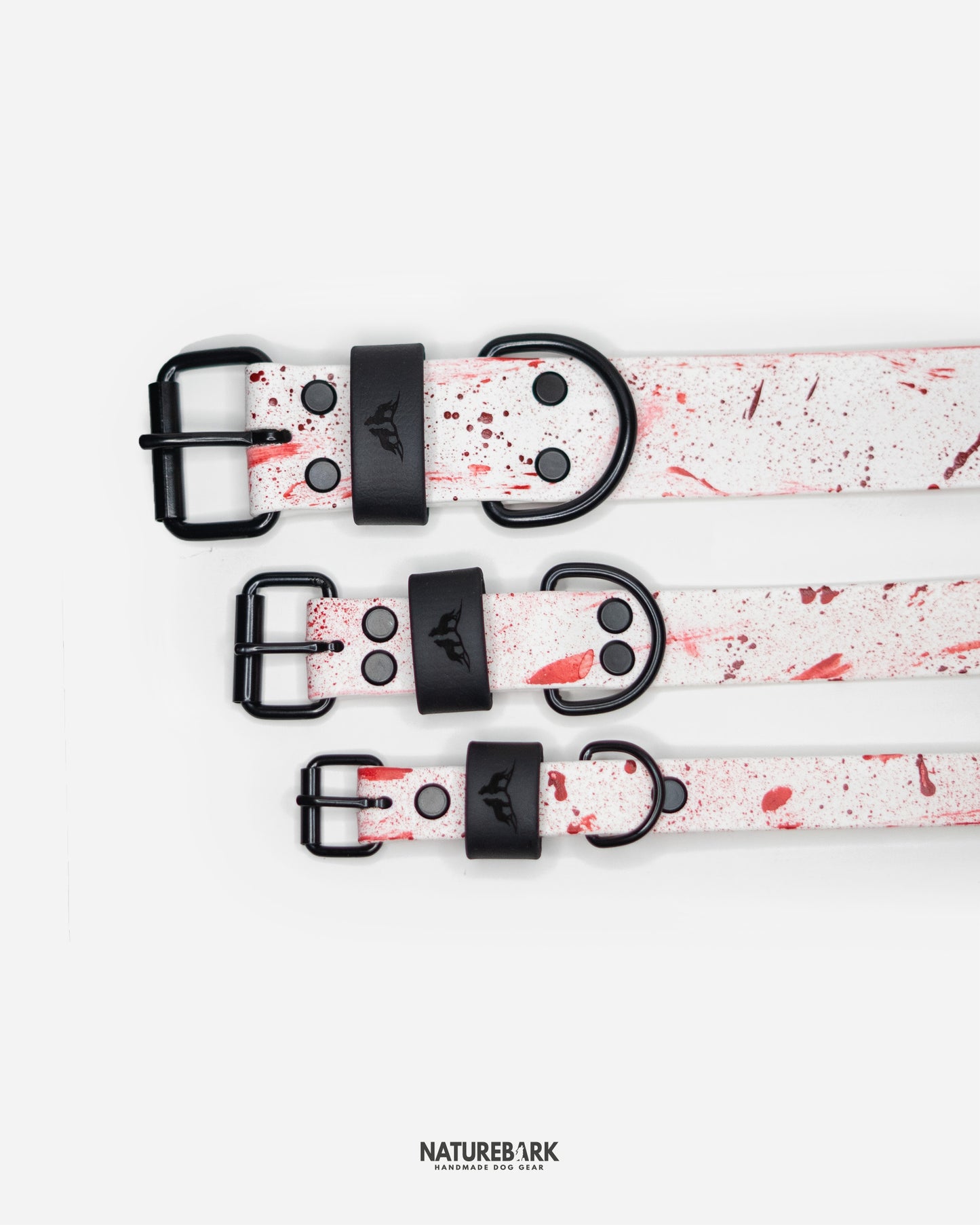Für echte Horrorfans. Das Design ist mittels spezieller Farbe aufgetragen und versiegelt. Somit ist es genau so Robust und Wasserfest wie die anderen Halsbänder. Jedes Halsband wird dadurch ein absolutes Unikat.