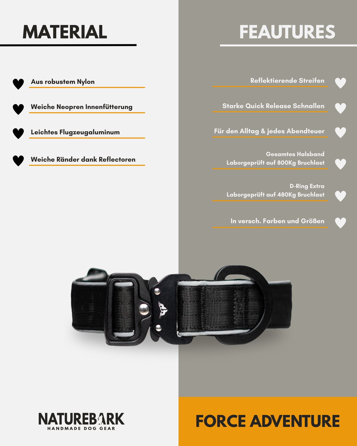 Robust, federleicht und perfekt abgestimmt auf unser Force Adventure Geschirr – das Halsband vereint höchste Sicherheit mit maximalem Komfort. Ob Alltagsspaziergang, Training oder Abenteuer im Dunkeln: Dieses Halsband schützt, hält stand und bleibt dabei angenehm leicht für deinen Hund.