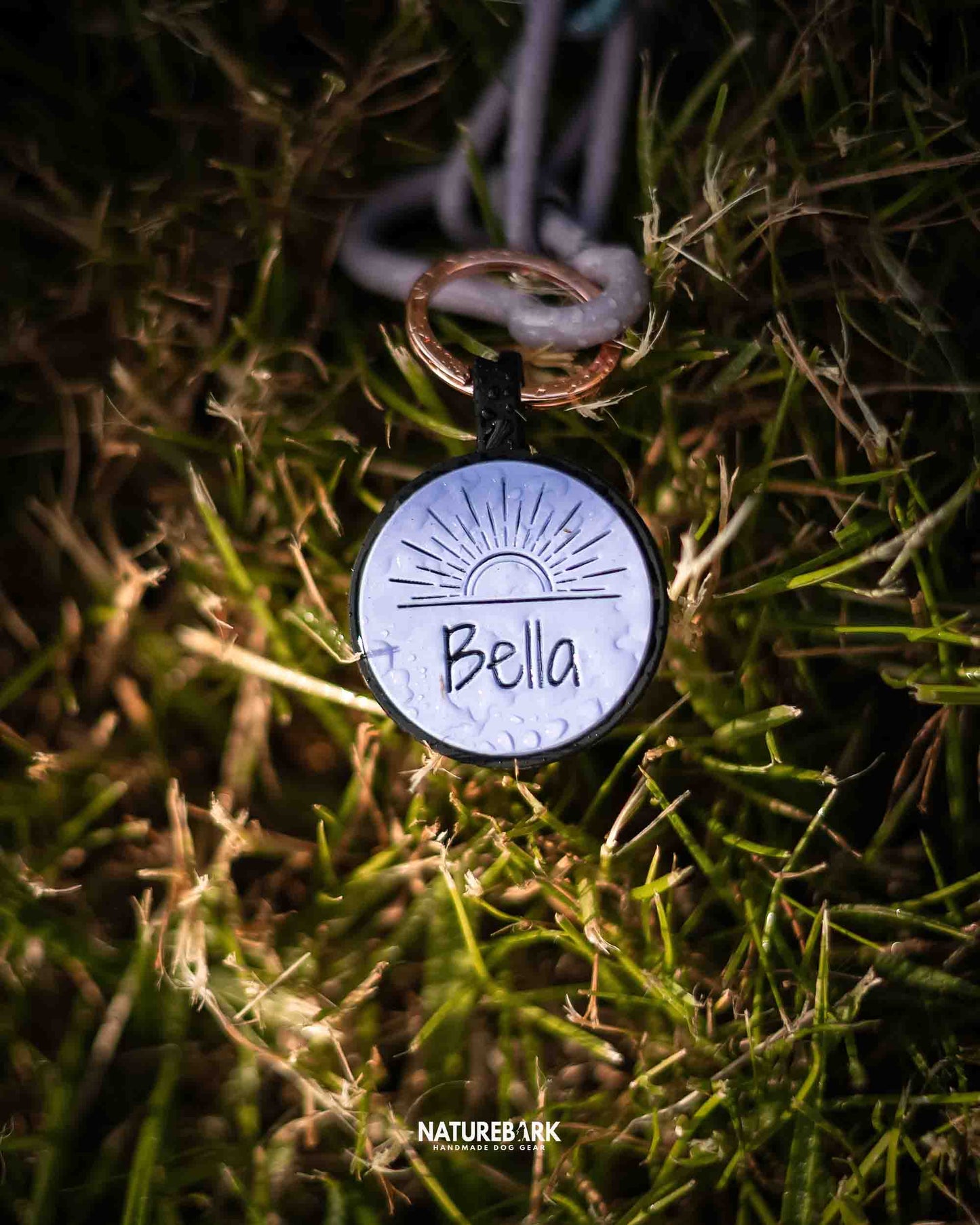 It's easy: You get a key ring included. Simply thread it through the hole in the tag and then attach it to your collar or harness. Done!