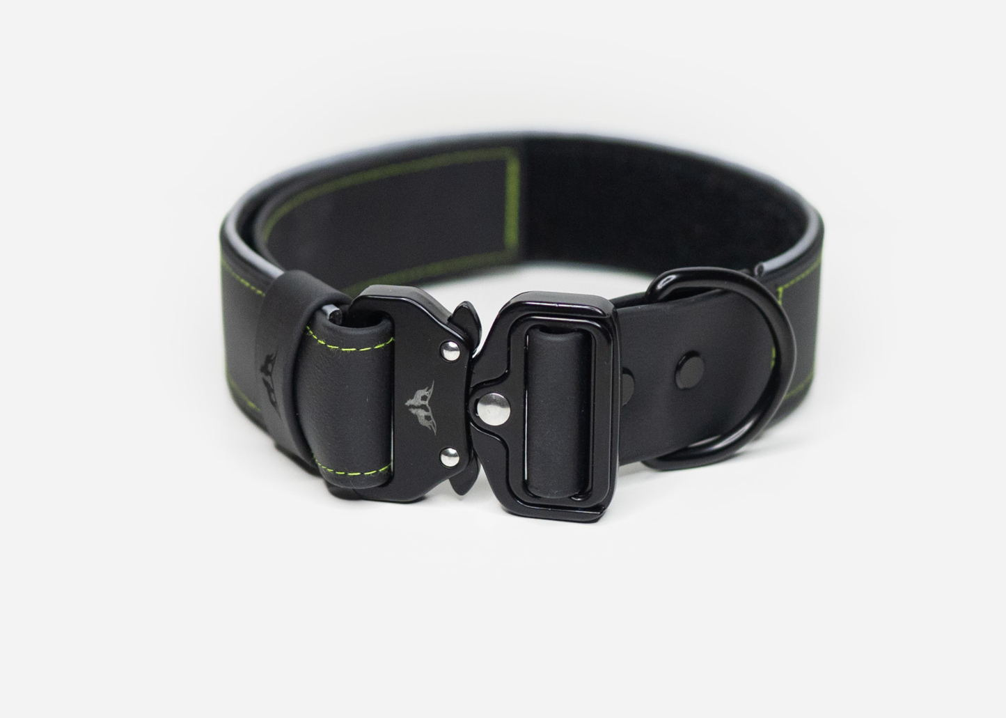 Standardmäßig kommt das Halsband mit unserer Aluminium Quick Release Schnalle. Sie öffnet sich nur, wenn beide Hebel gleichzeitig gedrückt werden — sonst bleibt sie sicher geschlossen.